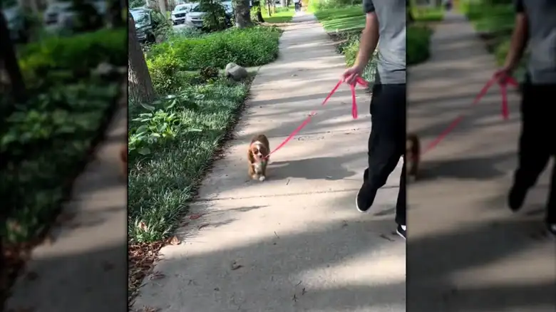 Toula was rescued from a puppy mill and has been petrified of the outdoors ever since, according to the video caption, but on August 30, 2025, her fear began to fade. Her humans carried her two doors down from their home and encouraged her to walk on home — dog leash attached. Although she attempted to return home down the first sidewalk she saw, they were pleased that she walked as far as she did. Toward the end of the clip, Toula resumed her brief quest back to the comfort and safety of her home.