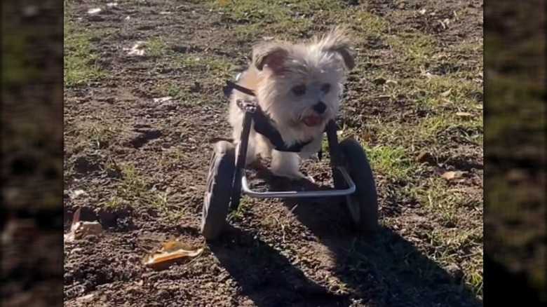 Senior pup Noel is another wheelchair veteran. She was injured as a puppy and had to have her two front legs amputated. Despite her serious injury, she adapted wonderfully and showed off the determination that's carried her through the years. For the past decade, she's depended on her wheels to get around outside. She doesn't need the help when she's indoors, as her strong back legs can bounce her around the smoother paths. Charming Facebook videos posted by @Noel the Bipawd Shorkie highlight her little moves.