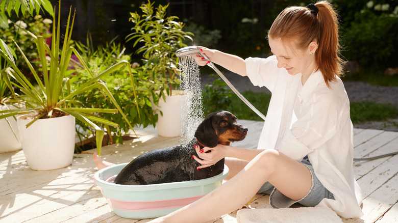 You can also apply apple cider vinegar to your pup's fur during bath time. This is a great option if you don't want your dog's coat to have that strong, vinegary stench. Wag! recommends mixing a 1 part ACV to 5-parts water ratio into a bowl or cup. After shampooing your canine, slowly pour the ACV mixture over them, gently massaging it into their fur and skin. Finally, rinse your pup using warm water, ensuring that no soap or ACV residue remains. Store any leftover mixture in the refrigerator for up to two weeks. You can safely repeat this process once or twice a month; you don't want to overdo it, as too much ACV can have the opposite effect.